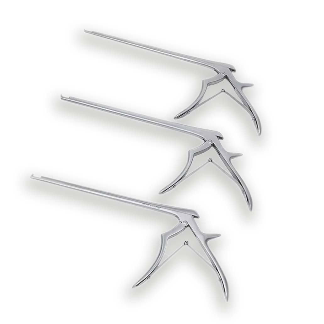 Son instrumentos quirúrgicos especialmente diseñados para eliminar pequeñas porciones de hueso o tejido en áreas confinadas, como la columna vertebral o el cráneo. Se reconocen por su forma delgada y mordaza móvil.