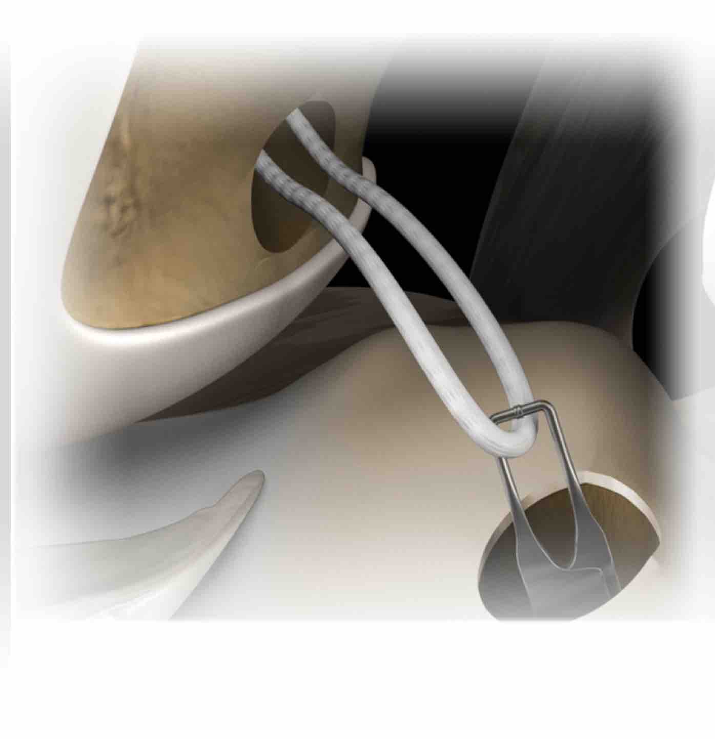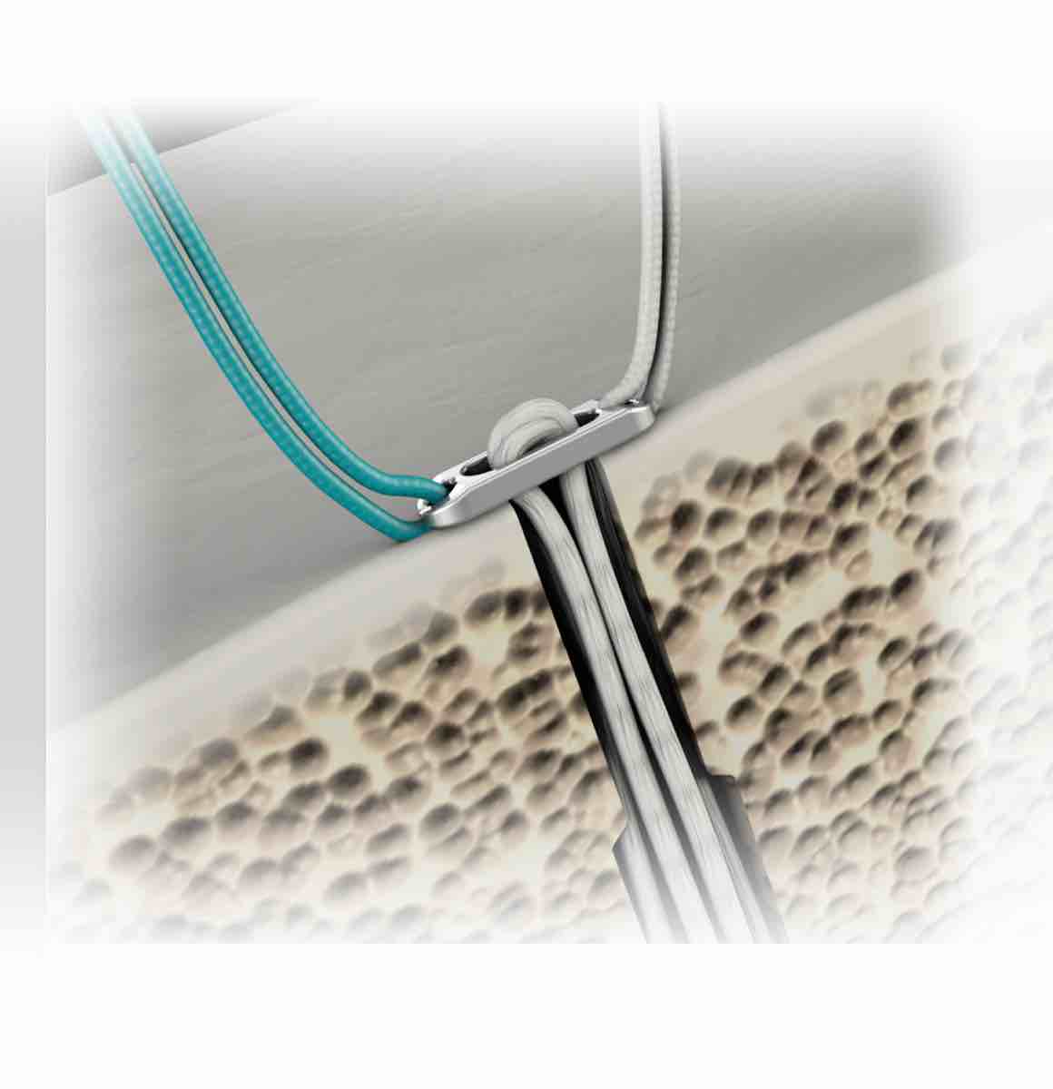 - Suturas de Avance y de Giro Integradas: Éste tipo de suturas permiten verificar que el botón ha rotado y quedado asentado contra la cortical, lo que reduce dudas sobre el posicionamiento final.
