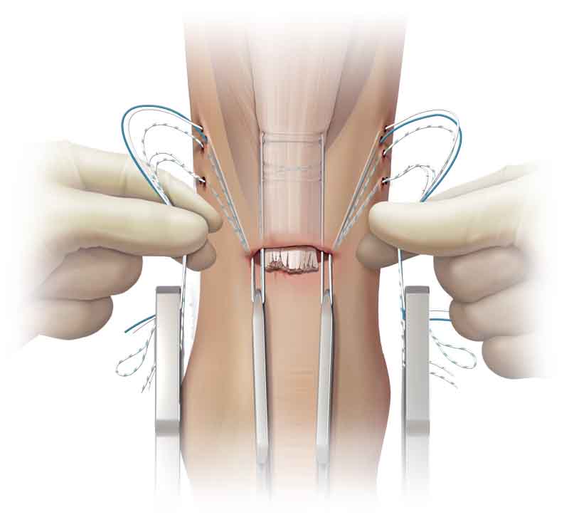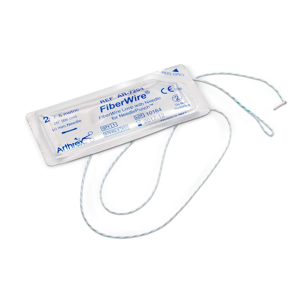 FiberWire de Arthrex combina un núcleo de polietileno de alto peso molecular con una cubierta trenzada que optimiza la resistencia a la tracción y la resistencia a la abrasión. Además, su acabado y el recubrimiento con colágeno puede facilitar el manejo y reducen la fricción al pasar por los tejidos en el área a tratar.